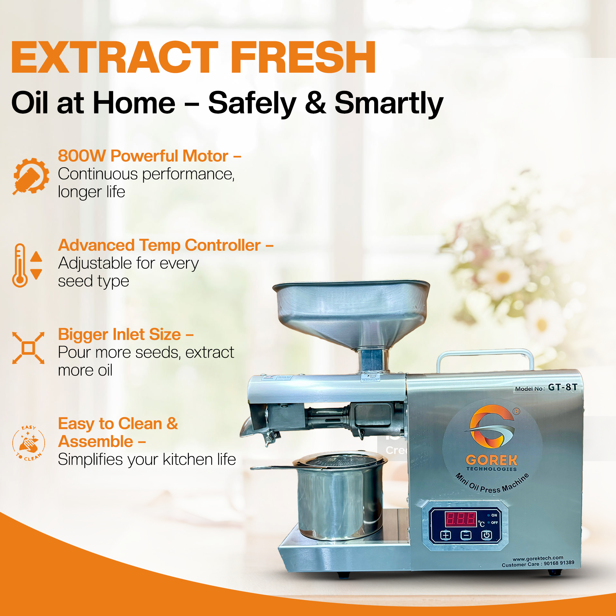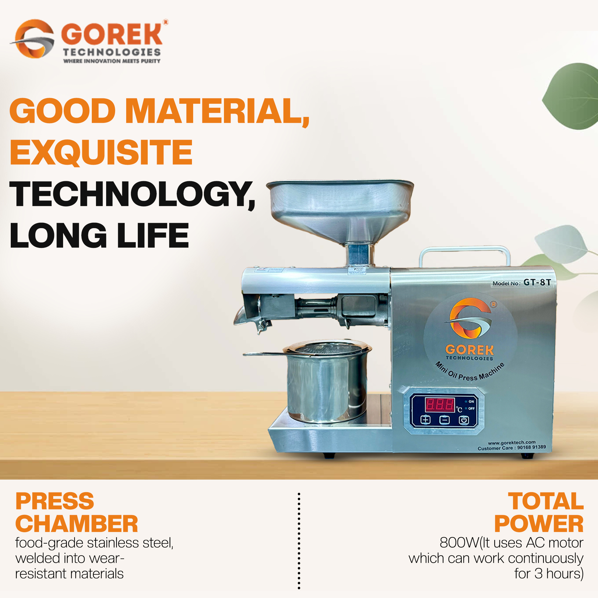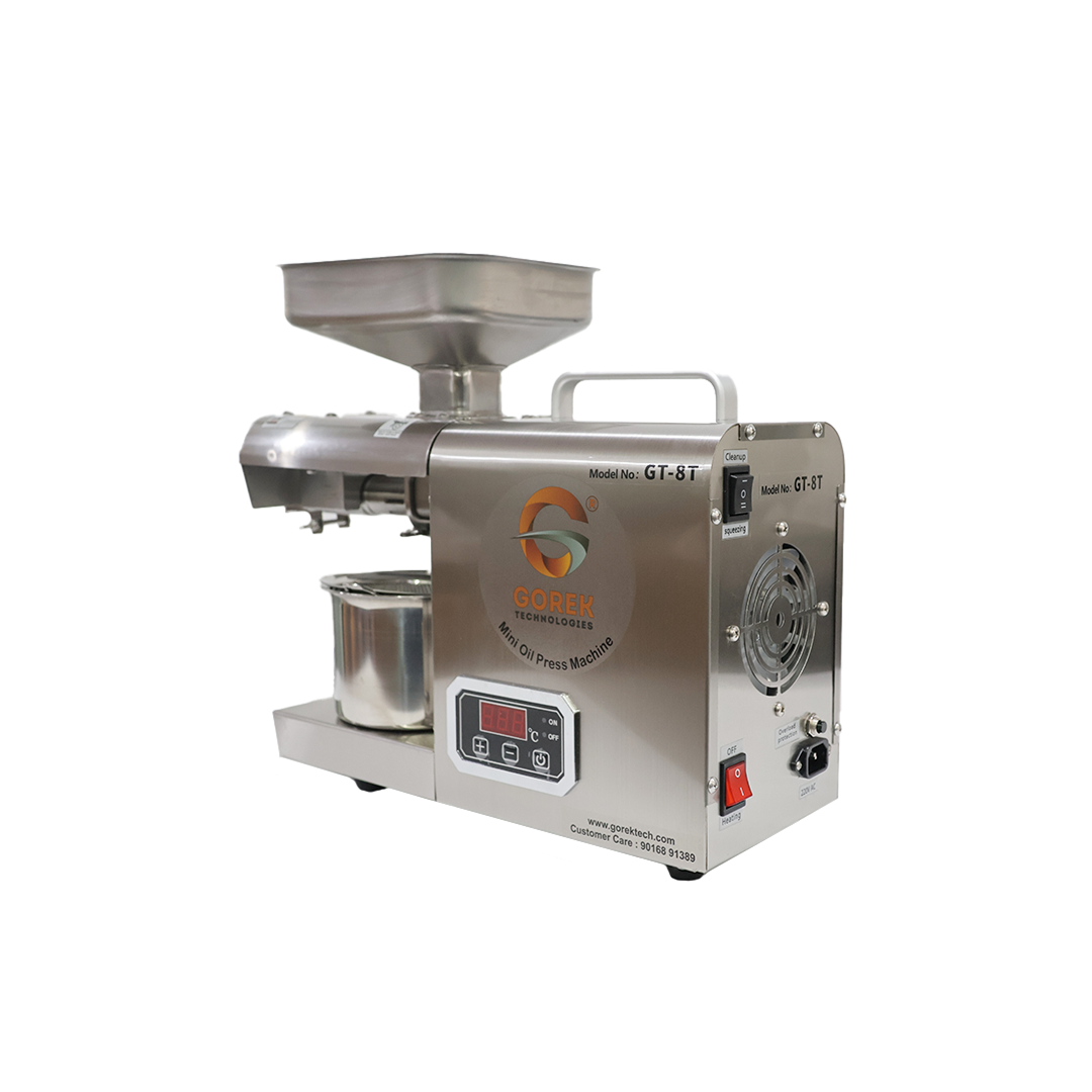 We believe in innovations and new technologies, hereby bring our new product OIL PRESS MACHINE GT-8T with higher capacity and advanced technology with digital temperature controller and compact-attractive design.
